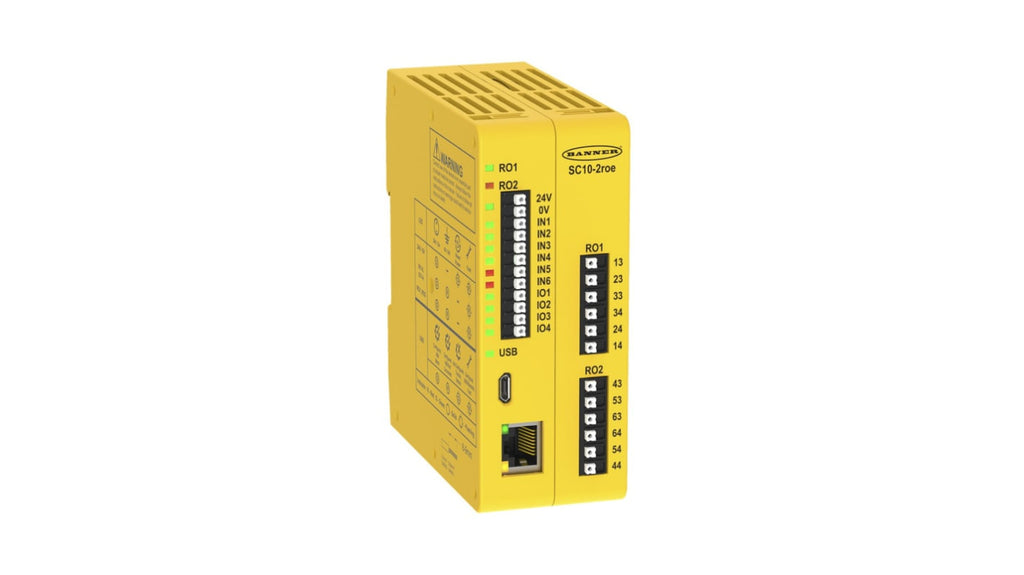 Controller di sicurezza, 10 ingressi, 2 uscite relè, tensione 24 V c.c., corrente nominale contatto 50 mA, morsetti a molla, grado di protezione IP20, dimensioni 45 x 100 x 115 mm, temperatura operativa da 0 a 55 gradi Celsius, comunicazione Modbus e Profibus, conforme a En ISO 13849 e SIL 3. Modello SC10-2ROE, serie SC10.