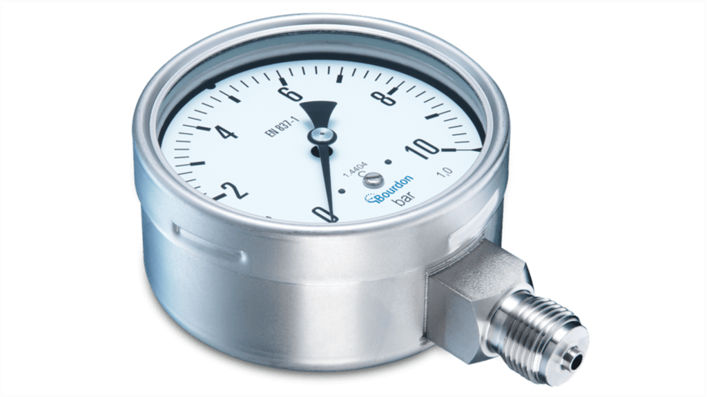 Manometro Bourdon, misura di pressione da -1bar a 9bar, attacco radiale G 1/2, diametro esterno 100mm, costruzione in acciaio inox, grado di protezione IP65, classe 1 secondo EN 837-1, parti bagnate in acciaio inox o Monel, approvazione Lloyds Register, riempimento di liquido opzionale per riduzione vibrazioni, materiale contenitore opzionale 1.4404 (316L) per atmosfere aggressive.