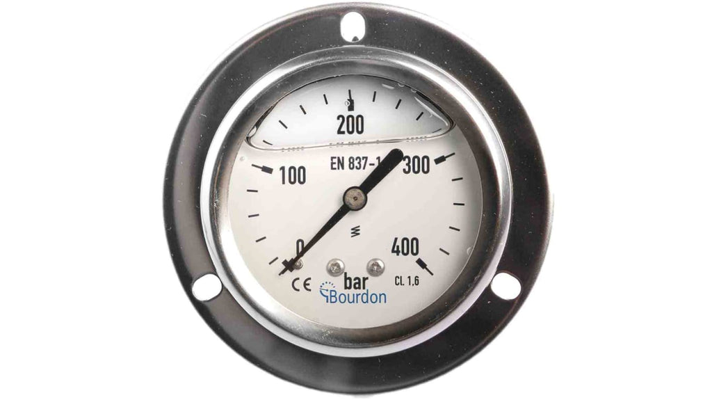 Manometro Bourdon, misura di pressione da 0bar a 400bar, diametro esterno 63mm, attacco posteriore, display analogico, precisione ± 1.6%, contenitore in acciaio inox, parti bagnate in ottone, per gas e liquidi non corrosivi, riempito di liquido per applicazioni con pulsazioni o vibrazioni, temperatura operativa da -10°C a +70°C, conforme alla norma EN 837-1, applicazioni OEM.