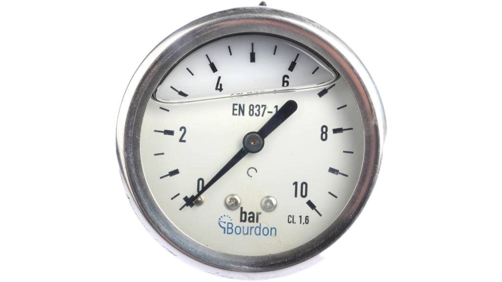 Manometro Bourdon, misura di pressione da 0bar a 10bar, diametro esterno 63mm, attacco posteriore, display analogico, precisione ± 1.6%, contenitore in acciaio inox, parti bagnate in ottone, riempito di liquido per applicazioni con pulsazioni o vibrazioni, temperatura operativa da -10°C a +70°C, conforme alla norma EN 837-1, applicazioni OEM. Codice costruttore MIT3-F22.B22.