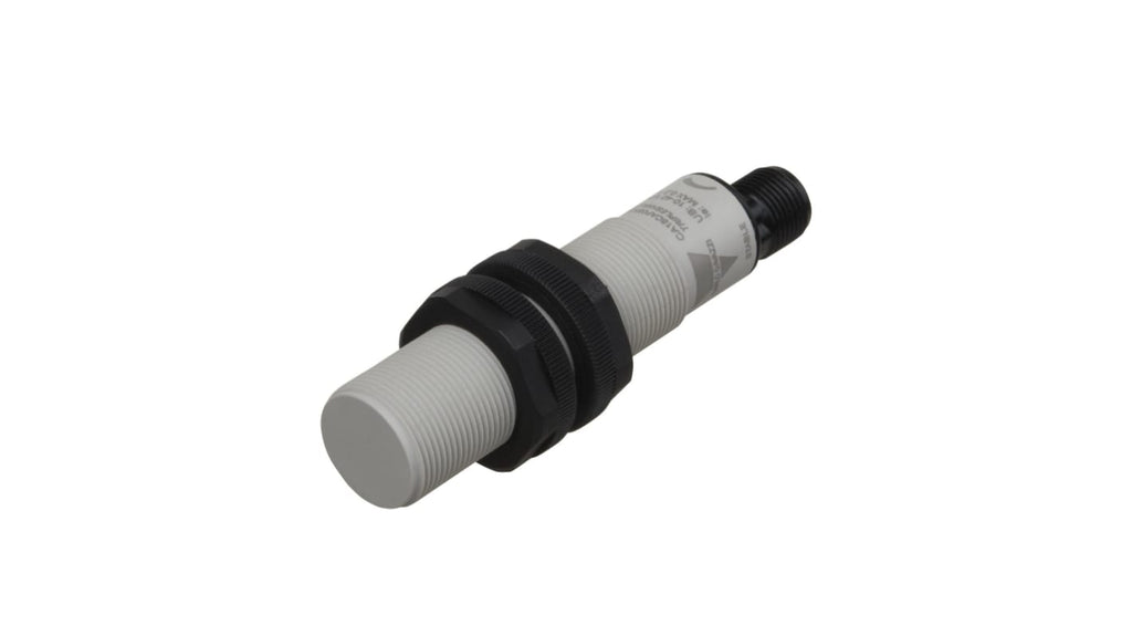 Sensore di prossimità cilindrico, tecnologia capacitiva, NPN, M18 x 1, distanza di rilevamento 8 mm, tensione di alimentazione 10-40 V c.c., grado di protezione IP67 e IP69K, connettore maschio M12, immunità alle interferenze elettromagnetiche, indicazione di stabilità tramite LED, allarmi per polvere e temperatura, protezione contro inversione di polarità, cortocircuiti e transienti.