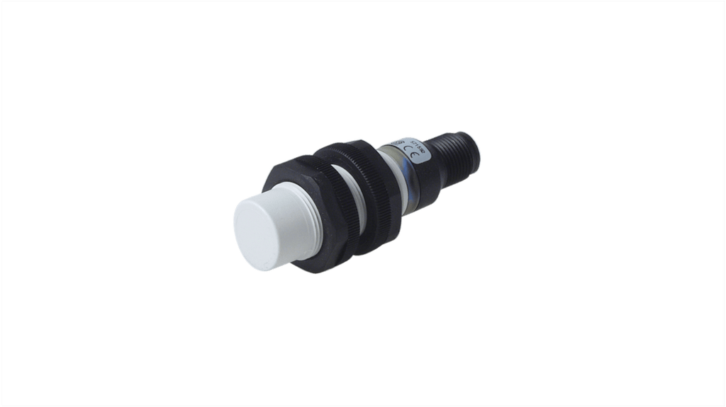 Sensore di prossimità induttivo cilindrico, tecnologia induttiva, dimensione filetto M18 x 1, tipo uscita PNP, gamma di rilevamento 8 mm, tensione di alimentazione 10 a 40 V c.c., grado di protezione IP67, frequenza di commutazione massima 400 Hz, ritardo di accensione inferiore a 10 millisecondi, connettore maschio M12, marcatura CE, omologazioni UL e CSA, protezione contro cortocircuiti e inversione di polarità.