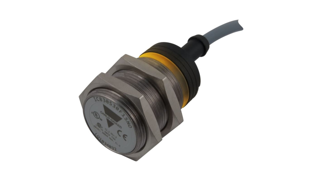 Sensore di prossimità induttivo cilindrico, tecnologia induttiva, corpo in ottone nichelato, dimensione filetto M30 x 1.5, uscita NPN, gamma di rilevamento 15 mm, tensione di alimentazione 10-36 V CC, grado di protezione IP67, protezione contro inversione di polarità, cortocircuiti e transienti, indicazione LED per uscita ON, conforme allo standard IEC 60947 5 2, certificato CSA per luoghi di lavoro pericolosi.