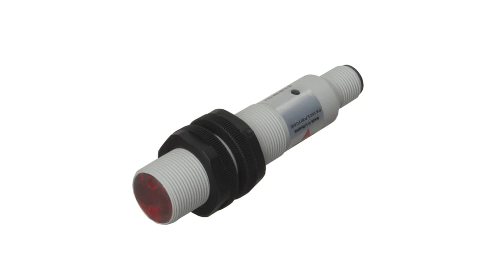 Sensore fotoelettrico cilindrico a riflessione retrò polarizzato, rilevamento fino a 2000 mm, uscita a due fili, connettore M12. Luce rossa modulata, grado di protezione IP67, indicazione di uscita a LED, protezione contro i transienti, commutazione buio. Design in contenitore PBTP cilindrico da 18 mm, senza necessità di regolazione.
