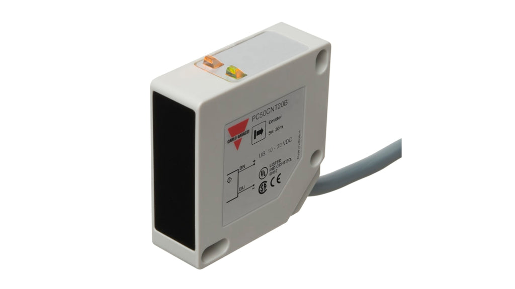 Sensore fotoelettrico rettangolare a fascio passante, rilevamento fino a 20000 mm, uscita NPN, contenitore in PC e ABS rinforzato, dimensioni 17 x 50 x 50 mm, grado di protezione IP67, protezione contro inversione di polarità, cortocircuiti e transienti, eccellenti prestazioni EMC, LED per indicazione stabilità segnale e uscita, luce rossa modulata e a infrarossi, configurazione completamente programmabile.