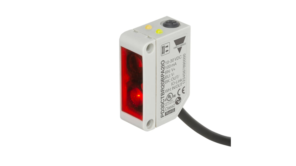 Sensore fotoelettrico rettangolare a riflessione diffusa, rilevamento 0 a 200 mm, uscita PNP/NPN, grado di protezione IP67, immunità ai vicini, contenitore in ABS 10 x 20 x 30 mm, completamente configurabile tramite IO Link v1.1, protezione contro inversione di polarità, cortocircuiti e transienti, timer impostabile, modalità di commutazione luce/buio, soppressione sfondo rosso o a infrarossi.