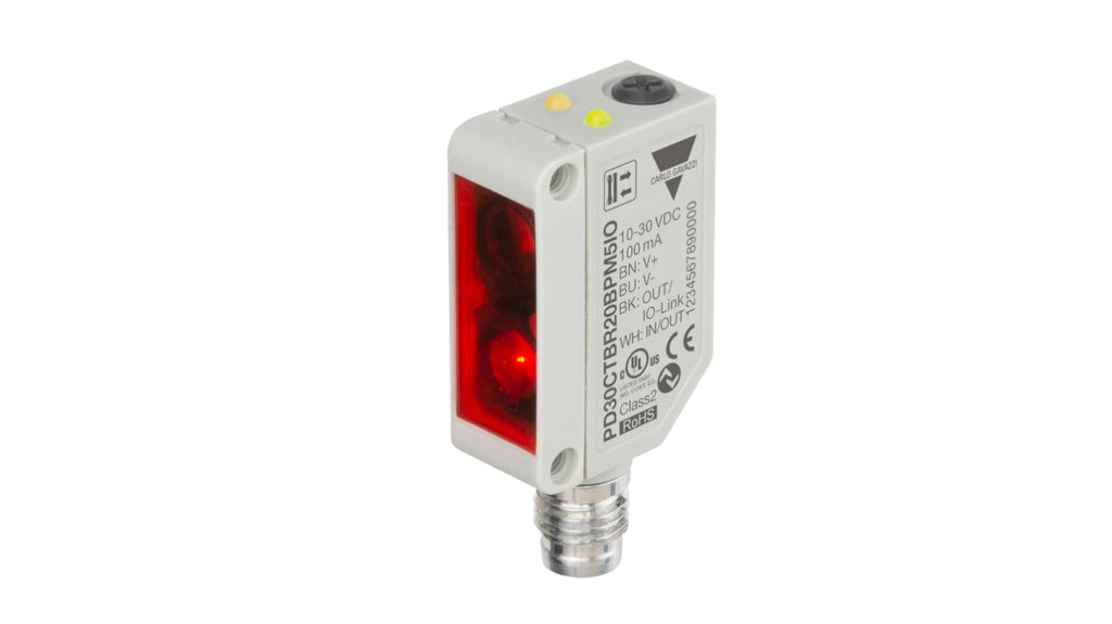 Sensore fotoelettrico rettangolare a riflessione diffusa, rilevamento 0 a 200 mm, uscita PNP/NPN, connettore M8, grado di protezione IP67, immunità ai cortocircuiti e ai transienti, configurabile tramite IO Link v1.1, timer impostabile, soppressione sfondo rosso o a infrarossi, dimensioni 10 x 20 x 30 mm, materiale ABS.