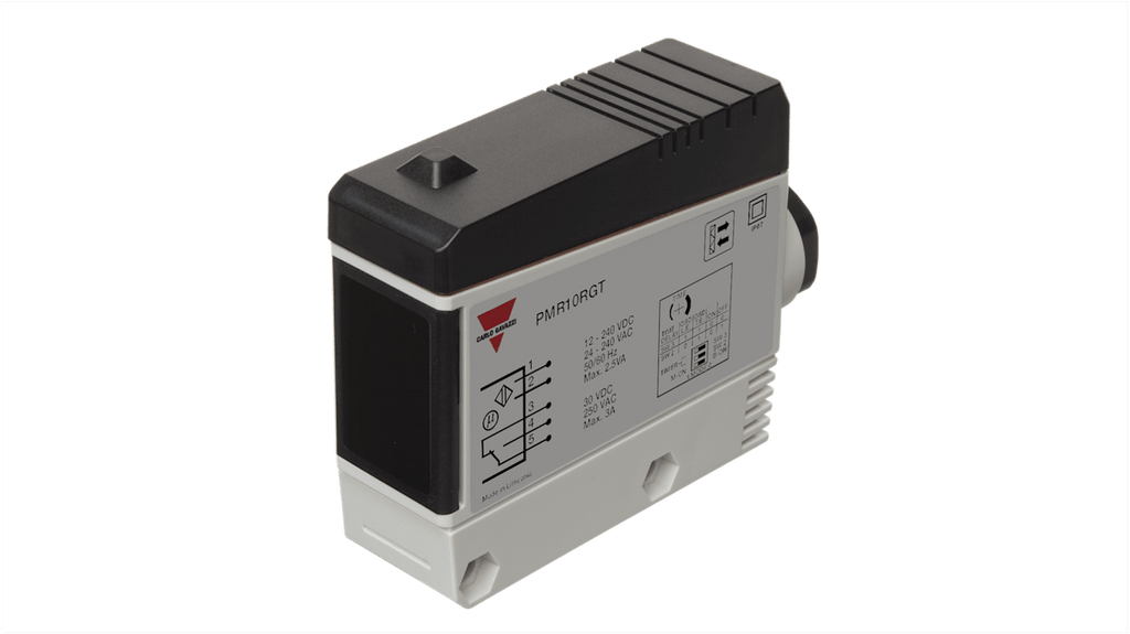 Sensore fotoelettrico rettangolare a retroriflessione, portata fino a 10000 mm, uscita relè, immunità alla luce ambientale, collegamento a vite, contenitore in plastica 25 x 65 x 81 mm, opzioni timer, sensibilità fissa, grado di protezione IP67, luce modulata e a infrarossi, indicazione a LED per obiettivo rilevato.