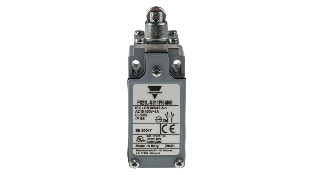 Interruttore di fine corsa serie PS21L, tasto a rotella, configurazione SPDT, stato normale NO/NC, protezione IP66, corrente massima 24 V c.a. 10 A, 24 V c.c. 2,8 A, materiale custodia in zinco, azione rapida, connessione 1/2 in NPT, temperatura operativa da -25°C a +70°C, dimensioni 30.3 mm x 32.5 mm, orientamento di montaggio verticale.