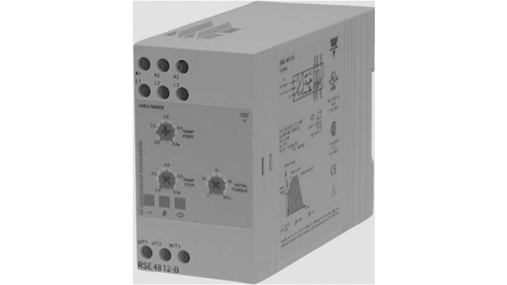 Avviatore soft-start trifase per motori, potenza nominale 5,5 kW, tensione operativa 227-480 V c.a., corrente nominale 12 A, grado di protezione IP20. Regolazione indipendente del tempo di avviamento e coppia iniziale, bypass integrale del semiconduttore, protezione contro sovratensioni transitorie. Dimensioni: 45 mm (L) x 102.5 mm (P) x 77.4 mm (H). Marchio Carlo Gavazzi, serie RSE.