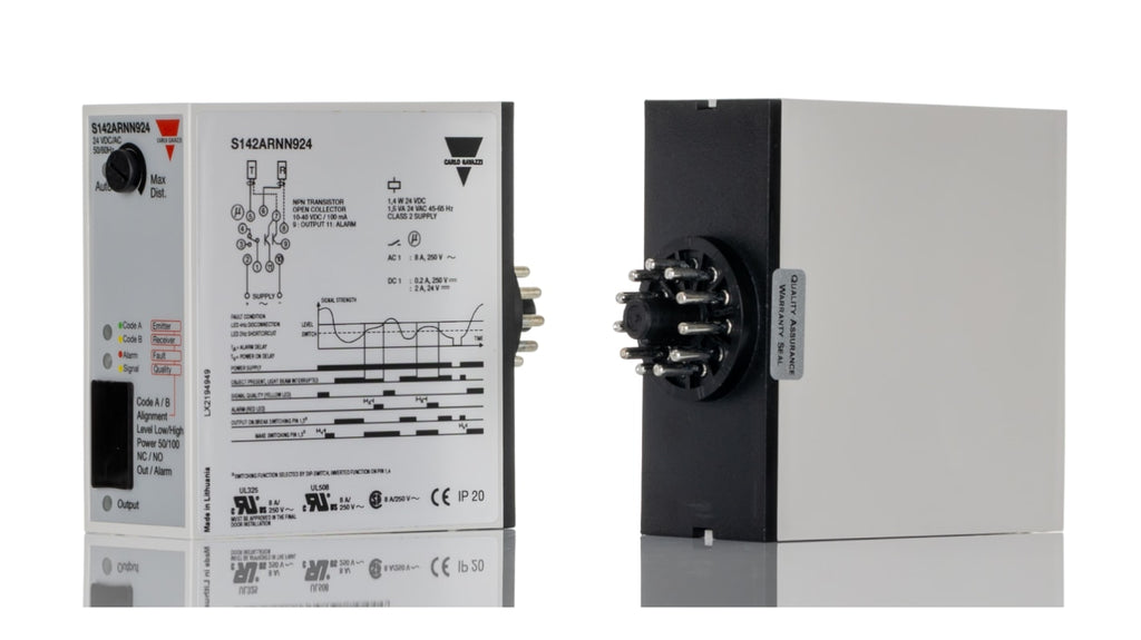 Sensore foto amplificatore serie S14 Carlo Gavazzi, uscita 2 NPN, relè, tensione massima 24V c.a. e c.c., sorgente di luce LED, grado di protezione IP20, tempo di risposta 20 ms e 30 ms, temperatura operativa da -20°C a +50°C, custodia in NORYL SE1, terminazione a 11 pin per installazione rapida, controllo con processore μ, diagnostica automatica, indicatori LED per vari processi.