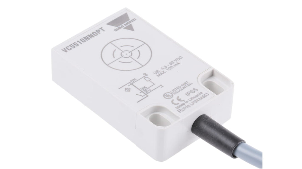 Sensore di livello capacitativo, uscita NPN, gamma di rilevamento 2-10 mm regolabile, indicazione LED attivato, tensione di alimentazione 5-30 V c.c., corrente massima 100 mA, ritardo di accensione max 40 ms, max 5 s per versioni di ritardo ON/OFF, temperatura operativa 0-50 °C, grado di protezione IP65, materiale contenitore ABS e policarbonato, cavi PVC 1,5 m. Marchio CE.