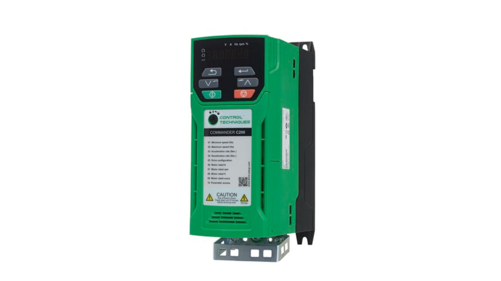 Inverter per controllo motori c.a., potenza nominale 0,75 kW, tensione di alimentazione 380-480 V, 3 fasi, frequenza di uscita 0-550 Hz, corrente nominale 2,3 A, montaggio a pannello, grado di protezione IP20, PLC a bordo, coppia di sicurezza doppia disattivata, opzioni plug-in per controllo avanzato, design robusto, dimensioni 150 mm x 75 mm x 205 mm. Codice costruttore C200-02400023, marchio Control Techniques.