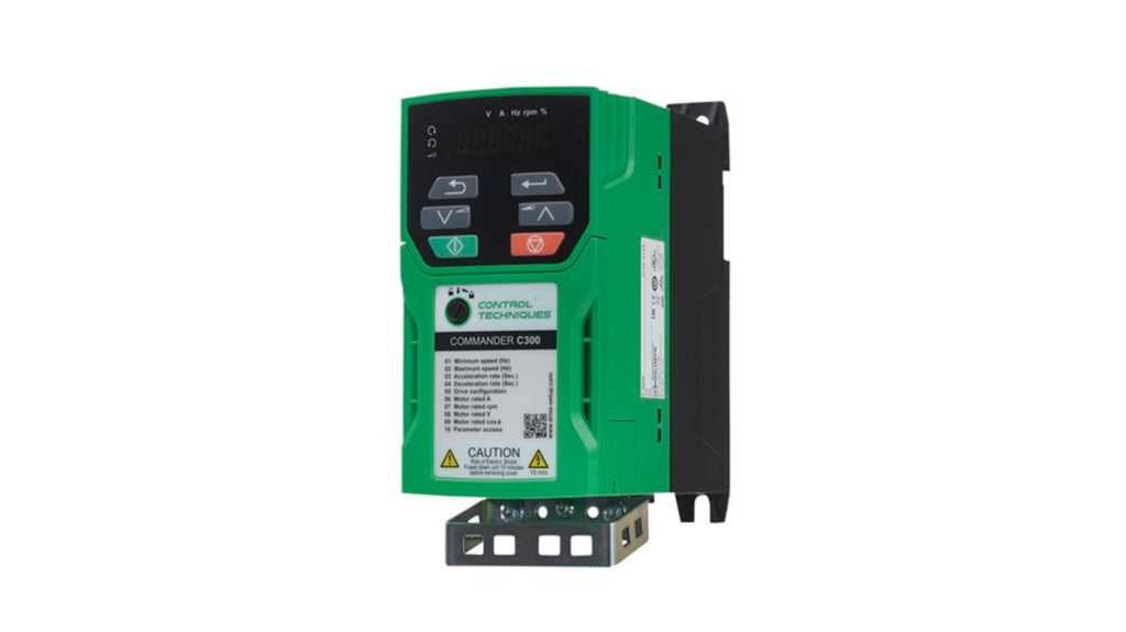 Inverter per motori c.a., potenza nominale 0,37 kW, tensione di alimentazione 200-240 V c.a., fase 1, frequenza di uscita 0-550 Hz, corrente nominale 2,4 A, montaggio a pannello, grado di protezione IP20, PLC a bordo, design robusto, sovraccarico fino al 180%, opzioni plug-in per controllo avanzato, facile abbinamento motore, installazione semplificata. Codice costruttore C300-01200024, marchio Control Techniques.