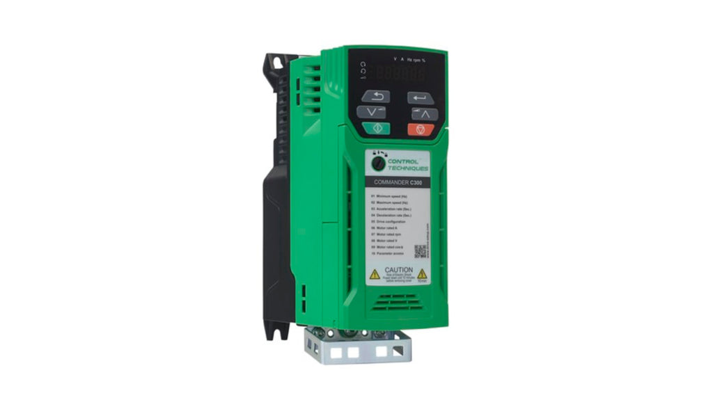 Inverter per controllo motori in corrente alternata, potenza nominale 1,5 kW, tensione di alimentazione 380 a 480 V, 3 fasi, frequenza di uscita 0 a 550 Hz, sovraccarico fino al 180%, grado di protezione IP20, montaggio a pannello, PLC a bordo, comunicazione field bus con opzioni plug-in, dimensioni 150 mm x 75 mm x 205 mm, codice costruttore C300-02400041, marchio Control Techniques.