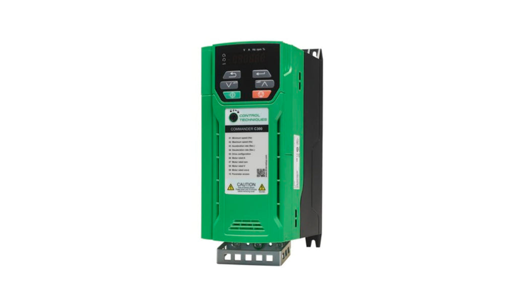 Inverter per motori c.a., potenza nominale 2,2 kW, tensione di alimentazione 200-240 V c.a., 3 fasi, frequenza di uscita 0-550 Hz, corrente nominale 10 A, montaggio a pannello, grado di protezione IP20, PLC a bordo, coppia di sicurezza doppia disattivata, opzioni plug-in per controllo avanzato, design robusto, dimensioni 90 mm x 160 mm x 226 mm. Codice costruttore C300-03200100. Marchio Control Techniques.