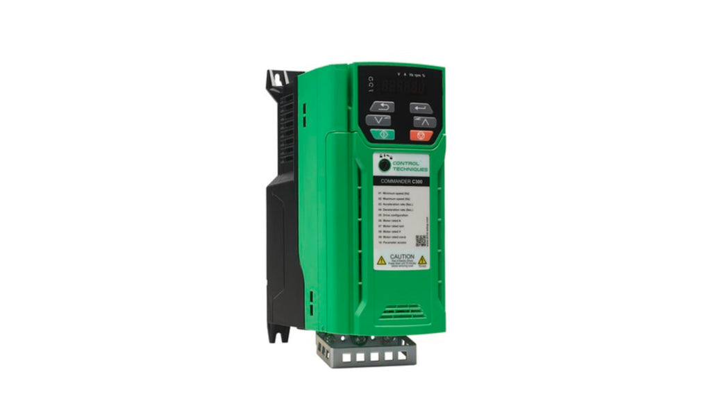 Inverter per motori c.a., potenza nominale 2,2 kW, tensione di alimentazione 380-480 V, 3 fasi, corrente nominale 5,6 A, frequenza di uscita 0-550 Hz, montaggio a pannello, grado di protezione IP20, PLC a bordo, coppia di sicurezza doppia disattivata, opzioni plug-in per controllo avanzato, design robusto, dimensioni 90 mm x 160 mm x 226 mm. Codice costruttore C300-03400056. Marchio Control Techniques.