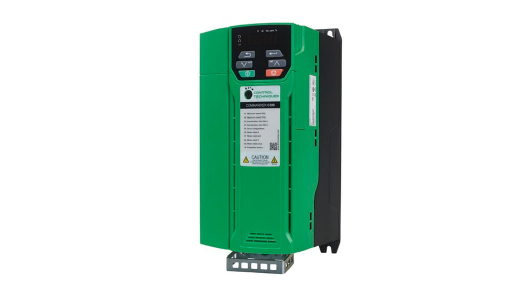Inverter per motori c.a., potenza nominale 7,5 kW, tensione di alimentazione 380-480 V, 3 fasi, frequenza di uscita 0-550 Hz, corrente nominale 17 A, montaggio a pannello, grado di protezione IP20, PLC a bordo, sovraccarico fino al 180%, opzioni plug-in per controllo avanzato, design robusto, dimensioni 115 mm x 175 mm x 277 mm, codice costruttore C300-04400170, marchio Control Techniques.