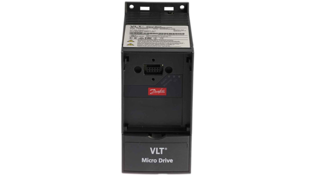 Inverter VLT FC51, potenza nominale 0,37 kW, ingresso monofase 230 V c.a., corrente nominale 2,2 A, frequenza di uscita 0 a 200 Hz (VVC+ Mode), 0 a 400 Hz (U/f Mode), montaggio a pannello, grado di protezione IP20, filtro RFI integrato, senza pannello di controllo, compatibile con motori in c.a., standard ISO 14001, RoHS, WEEE, dimensioni 150 mm x 70 mm x 148 mm.