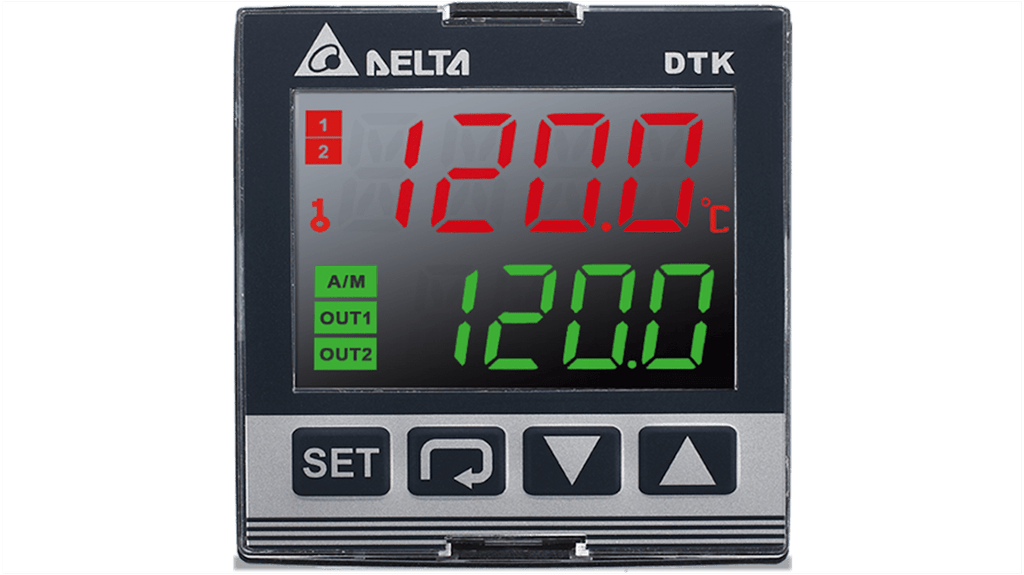 Regolatore di temperatura PID Delta Electronics, tensione di alimentazione 100-240 V, dimensioni 48 x 48 mm (1/16 DIN), montaggio a pannello, 2 uscite relè, 1 ingresso, controllo ON/OFF e PID, display LCD ad alta risoluzione, tempo di campionamento 100 ms, lunghezza 60 mm, foratura pannello 45 x 45 mm.