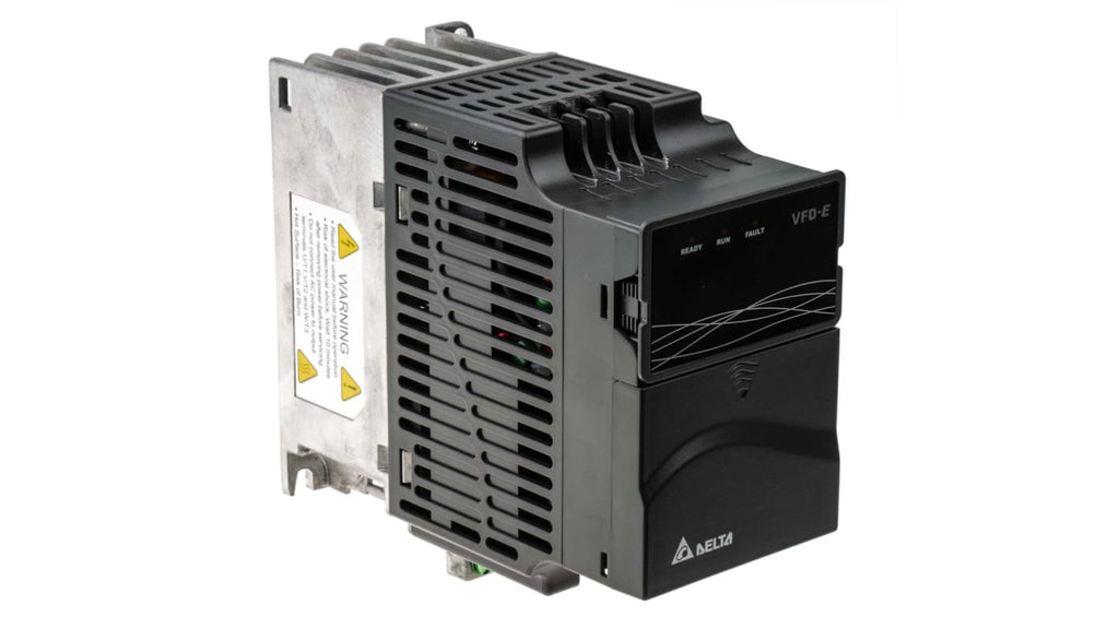 Inverter trifase a micro drive Delta Electronics, potenza nominale 0,75 W, tensione 460 V c.a., frequenza di uscita 0 a 600 Hz, grado di protezione IP20, corrente nominale 3,2 A, design modulare, funzione PLC incorporata, filtro EMI incluso, comunicazione RS485 ModBus, dimensioni 142 mm x 152 mm x 72 mm. Tastiera non inclusa, ordinabile separatamente.