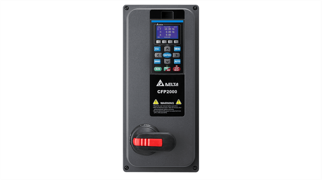 Inverter a frequenza variabile per montaggio a parete, Delta Electronics, potenza nominale 4 kW, tensione di alimentazione 400 V CA, 3 fasi, corrente nominale 10,5 A, filtro EMC incorporato, induttanza c.c. e chopper di frenata integrati, livello di protezione IP55, livello NEMA NEMA12, per uso con sistemi di raffreddamento, ventole, HVAC, pompe, serie CFP2000.