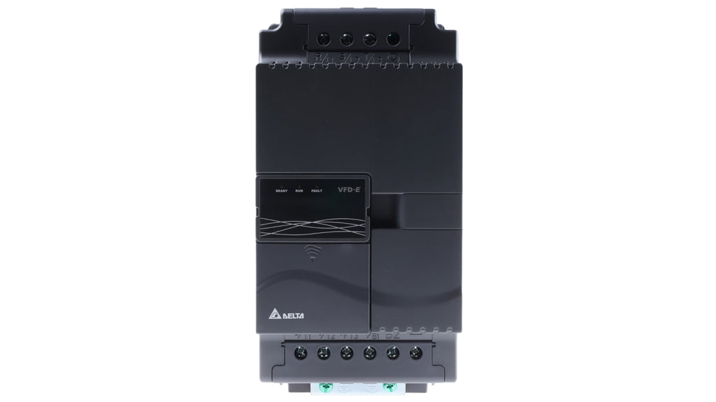 Inverter trifase Delta Electronics, 5,5 kW, 460 V c.a., 0 a 600 Hz, serie VFD-E, design modulare, IP20, filtro EMI incluso, funzione PLC incorporata, espansione flessibile, comunicazione RS485 ModBus, dimensioni 260 mm x 130 mm x 169.2 mm, corrente nominale 14 A. Applicabile a motori in c.a. per diverse macchine industriali. Tastiera non inclusa, ordinabile separatamente.