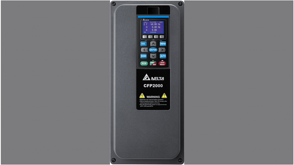 Avviatore a velocità variabile per motori CA, potenza nominale 7,5 kW, tensione 460 V, 3 fasi, corrente nominale 18/12 A, alloggiamento IP55, progettato per HVAC, ventole e pompe, capacità PLC integrata di 10.000 passi, supporto per motori IM o PM, serie CFP2000, funzioni integrate per riduzione tempi di configurazione e miglioramento efficienza operativa.