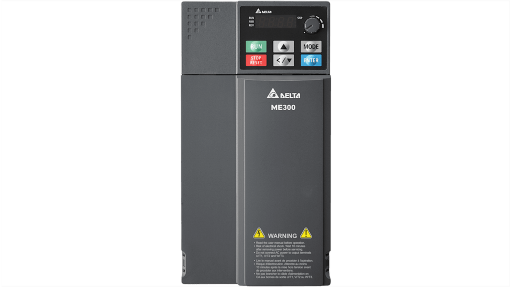 Inverter per motori c.a. Delta Electronics, potenza nominale 5,5 kW, tensione di alimentazione 460 V, trifase, corrente nominale 13 A, frequenza di uscita 0 a 599 Hz, grado di protezione IP20, temperatura d'esercizio da -20 a +40 gradi Celsius, interfaccia Modbus RS485, filtro EMI incorporato, design compatto, installazione standard, tastiera integrata, dimensioni ultracompatte.