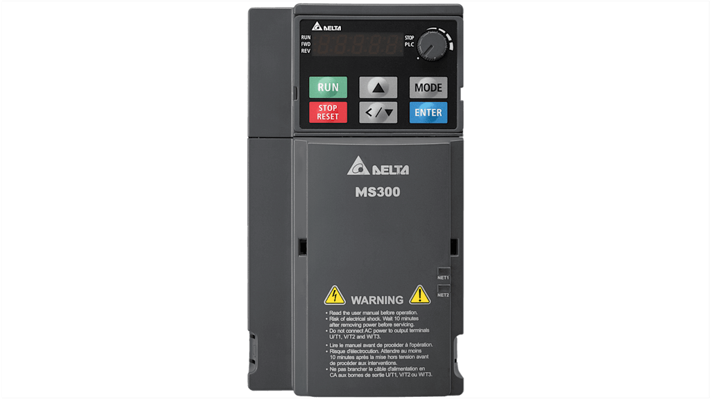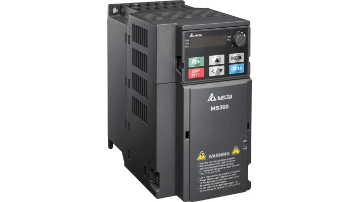 Inverter per motori c.a. Delta Electronics, potenza 2,2 kW, tensione 460 V, trifase, corrente nominale 5,5 A, frequenza di uscita 0 a 599 Hz, filtro EMI incorporato, interfaccia intuitiva, tastiera integrata, grado di protezione IP20, temperatura d'esercizio da -20 a +40 gradi Celsius, alimentazione segnale 24 V c.c., comunicazione Modbus RS485, velocità di trasmissione 4800 a 38400 bps.