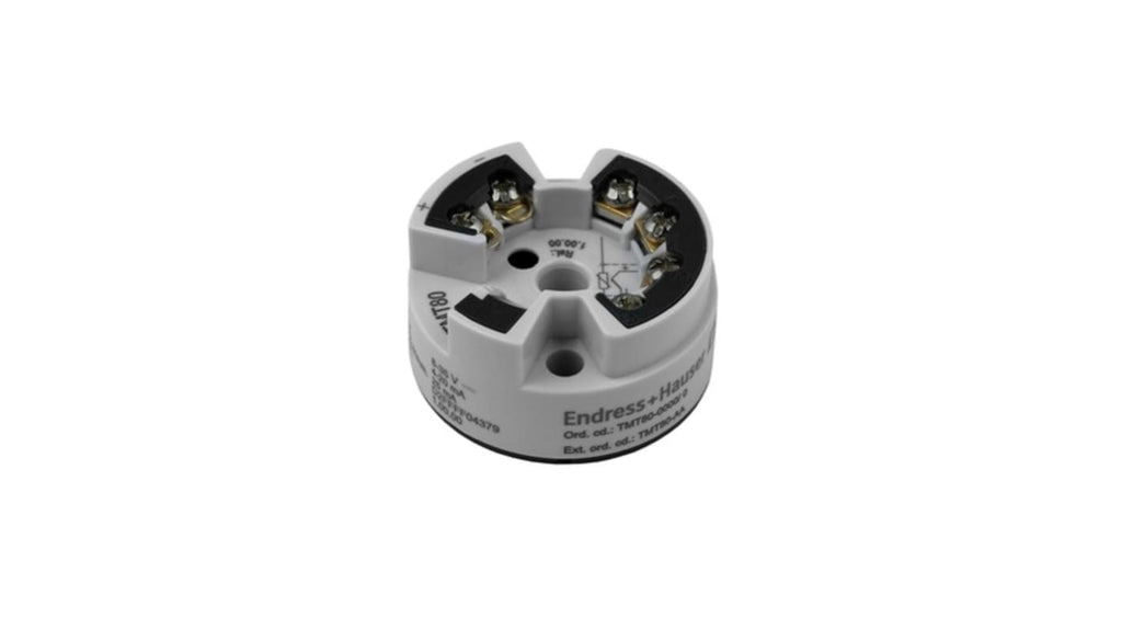 Trasmettitore di temperatura Endress+Hauser TMT80, ingresso da Pt100 a Pt1000, uscita analogica, intervallo di misurazione -40°C a 85°C, tensione di alimentazione 8-35 V, isolamento galvanico ingresso o uscita 500 V, diametro 44 mm, configurabile per massima precisione di misurazione.