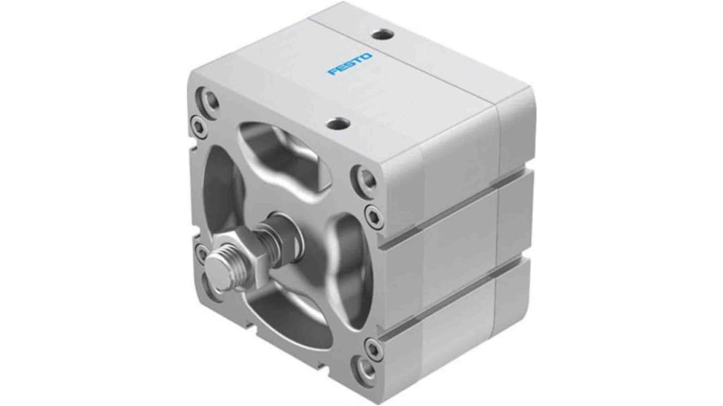 Cilindro pneumatico compatto a doppia azione, Festo, conforme a ISO 21287, foro 100mm, corsa 20mm, assemblabile in qualsiasi posizione, anello di ammortizzazione flessibile, adatto per aria compressa filtrata e lubrificata o non lubrificata, temperatura ambiente da -20 a 80 gradi Celsius, resistenza alla corrosione moderata, filettatura dello stelo M12x1,25.