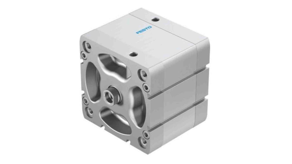 Cilindro pneumatico compatto a doppio effetto Festo. Foro 100mm, corsa 30mm, filettatura esterna dello stelo M12 femmina. Collegamento pneumatico G1/8, ammortizzazione flessibile su entrambe le estremità. Conforme allo standard ISO 21287. Marchio Festo, serie ADN, modello 536388. Diametro bobina 30mm.