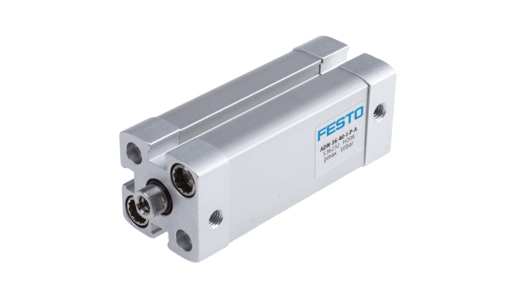 Cilindro pneumatico a doppio effetto, foro 16mm, corsa 40mm, collegamento pneumatico M5, pressione operativa massima 10 bar, conforme allo standard ISO 21287. Dimensioni 29 x 29 x 79.7mm, temperatura operativa da -20 a +80 gradi. Ammortizzazione flessibile, scanalatura per sensori di prossimità, struttura a basso attrito, montaggio verticale o orizzontale. Codice costruttore ADN-16-40-I-P-A, marchio Festo.