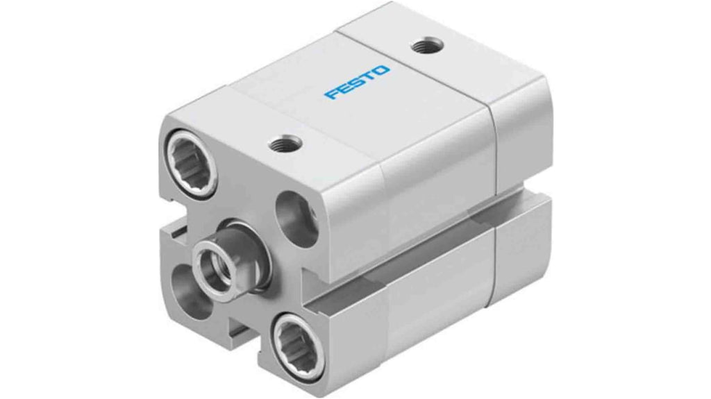 Cilindro pneumatico compatto a doppio effetto, foro 20mm, corsa 10mm, conforme a ISO 21287, adatto per aria compressa filtrata e lubrificata, ammortizzazione pneumatica autoregolante, assemblabile in qualsiasi posizione, temperatura ambiente da -20 a 80 gradi Celsius, resistenza alla corrosione moderata, filettatura M6 dello stelo del pistone. Marchio Festo, codice costruttore ADN-20-10-I-PPS-A.