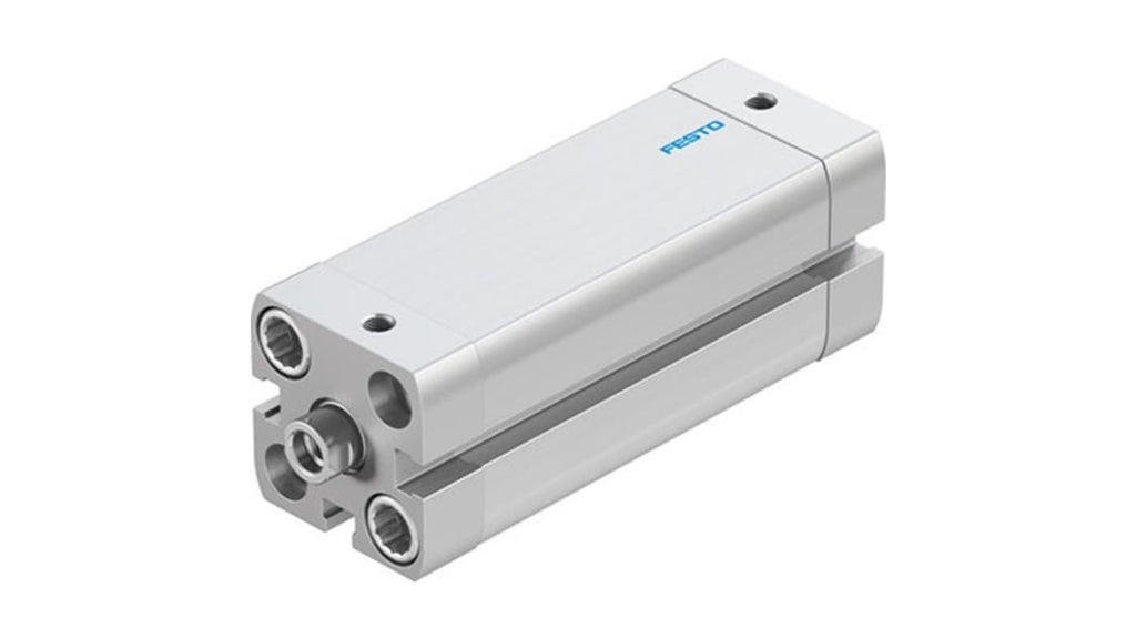 Cilindro pneumatico compatto Festo, doppio effetto, foro 20mm, corsa 70mm, collegamento pneumatico M5. Realizzato in lega di alluminio anodizzato e acciaio ad alta lega, con ammortizzazione pneumatica autoregolante. Compatibile con funzionamento lubrificato, rilevamento posizione tramite interruttore di prossimità. Design robusto, opzioni di montaggio flessibili, leggerezza della massa mobile per tempi di risposta rapidi.