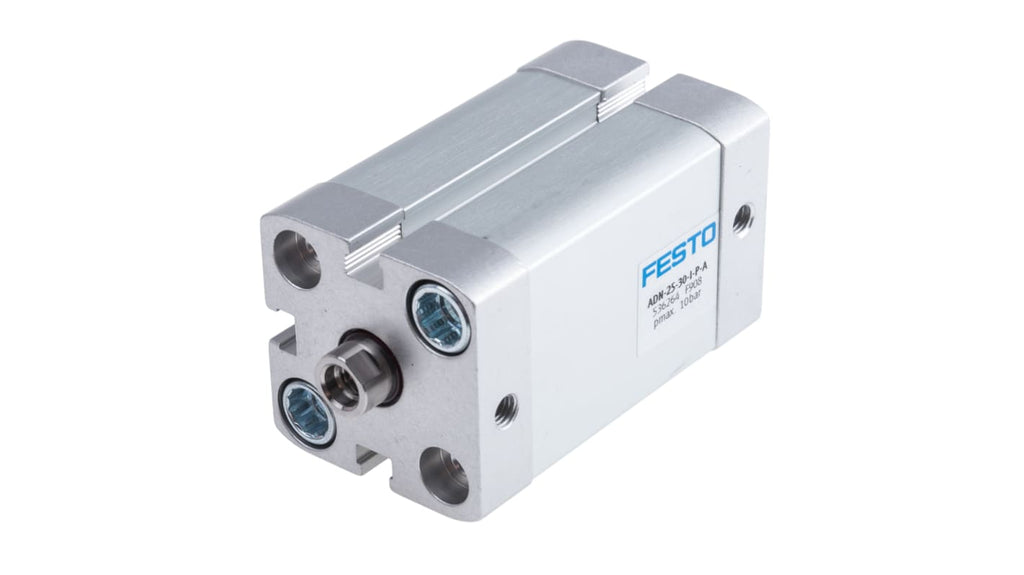 Cilindro pneumatico a doppio effetto, foro da 25 mm, corsa 30 mm, collegamento pneumatico M5, pressione operativa massima 10 bar, temperatura operativa da -20 a +80 gradi. Dimensioni 39.5 x 39.5 x 74.5 mm. Ammortizzazione flessibile, conforme allo standard ISO 21287, scanalatura per sensori di prossimità, struttura a basso attrito, montaggio verticale o orizzontale. Codice costruttore ADN-25-30-I-P-A, marchio Festo.