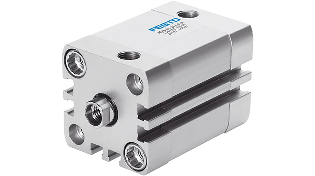 Cilindro pneumatico a doppio effetto Festo, foro da 32 mm, corsa 10 mm, collegamento G 1/8, pressione operativa massima 10 bar. Dimensioni 47 x 47 x 60 mm, filettatura asta pistone femmina M8. Ampio range di temperatura da -20 a +80 gradi Celsius, ammortizzamento elastico. Standard ISO 21287 e VDMA 24364. Adatto per applicazioni in settori industriali e medicali.