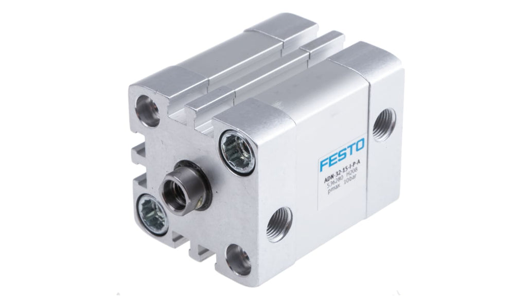 Cilindro pneumatico a doppio effetto, foro 32mm, corsa 15mm, attacco G 1/8, pressione operativa massima 10 bar. Conforme agli standard ISO 21287 e VDMA24364. Dimensioni 47 x 47 x 65mm, peso 310g. Funzionamento con aria compressa pulita e lubrificata, ammortizzazione con anelli ammortizzatori, temperatura operativa da -20 a +80 gradi. Scanalatura per sensori di prossimità, struttura in lega di alluminio resistente alla corrosione.