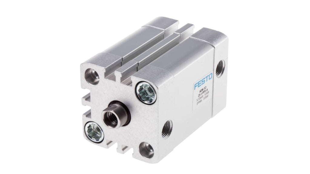 Cilindro pneumatico a doppio effetto, foro 32mm, corsa 25mm, attacco G 1/8, pressione operativa massima 10 bar. Conforme allo standard ISO 21287, dotato di ammortizzazione pneumatica autoregolante. Dimensioni 47 x 47 x 75mm, temperatura operativa da -20 a +80 gradi. Scanalatura per sensori di prossimità, struttura a basso attrito per funzionamento continuo. Codice costruttore ADN-32-25-I-PPS-A, marchio Festo.