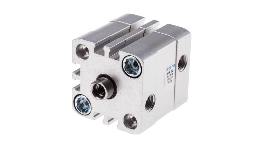 Cilindro pneumatico a doppio effetto, foro 32mm, corsa 5mm, collegamento G 1/8, pressione operativa massima 10 bar, temperatura operativa da -20 a +80 gradi. Dimensioni 47 x 47 x 55mm, conforme allo standard ISO 21287. Ammortizzazione flessibile, scanalatura per sensori di prossimità, struttura a basso attrito, montaggio verticale o orizzontale. Codice costruttore ADN-32-5-I-P-A, marchio Festo.