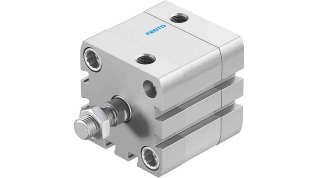 Cilindro pneumatico compatto a doppio effetto, foro 40mm, corsa 10mm, conforme a ISO 21287, adatto per aria compressa filtrata e lubrificata, ammortizzazione pneumatica autoregolante, pressione di esercizio 1-10 bar, temperatura ambiente da -20 a 80 gradi Celsius, filettatura stelo M10x1,25, assemblabile in qualsiasi posizione, resistenza alla corrosione moderata. Marchio Festo, modello ADN 572673.