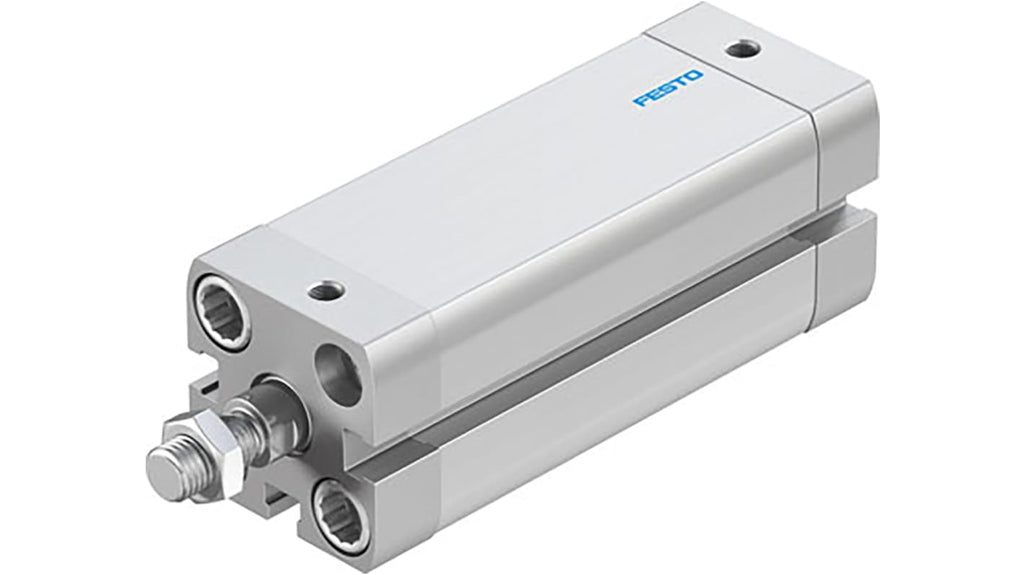 Cilindro pneumatico a doppio effetto, foro 40mm, corsa 20mm, attacco G 1/8, pressione operativa massima 10 bar, conforme allo standard ISO 21287. Dimensioni 54.5 x 54.5 x 71.1mm, temperatura operativa da -20 a +80 gradi Celsius. Ammortizzazione flessibile, scanalatura per sensori di prossimità, struttura a basso attrito, montaggio verticale o orizzontale. Codice costruttore ADN-40-20-A-P-A, marchio Festo.
