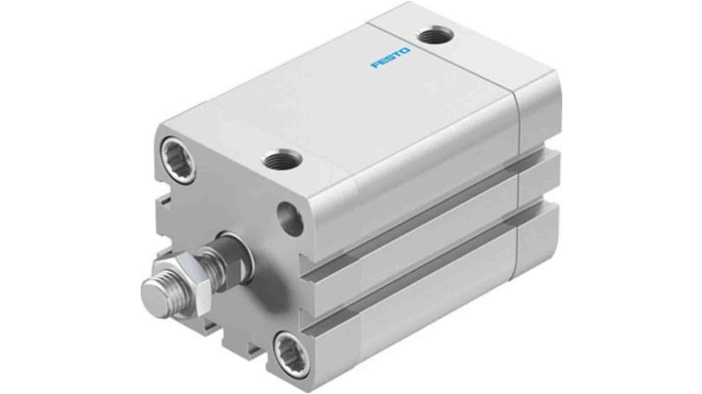 Cilindro pneumatico compatto a doppio effetto, Festo, conforme a ISO 21287, foro 40mm, corsa 40mm, pressione di esercizio 1-10 bar, filettatura stelo M10x1,25, ammortizzazione pneumatica autoregolante, temperatura ambiente da -20 a 80 gradi Celsius, resistenza a corrosione moderata, assemblabile in qualsiasi posizione.