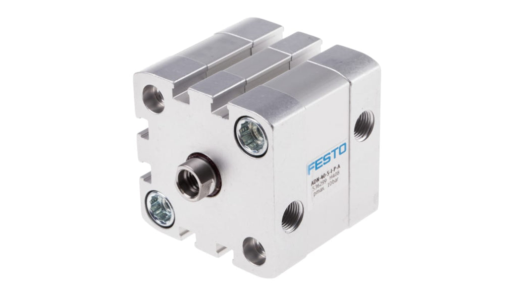 Cilindro pneumatico a doppio effetto, foro 40mm, corsa 5mm, collegamento G 1/8, pressione operativa massima 10 bar, temperatura operativa da -20 a +80 gradi. Dimensioni 54.5 x 54.5 x 56.1mm. Ammortizzazione flessibile, conforme allo standard ISO 21287, scanalatura per sensori di prossimità, struttura a basso attrito, montaggio verticale o orizzontale. Codice costruttore ADN-40-5-I-P-A, marchio Festo.