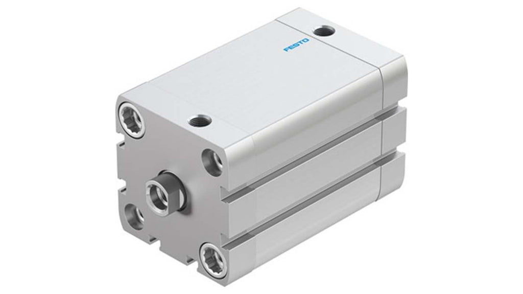 Cilindro pneumatico compatto Festo, doppio effetto, foro 50mm, corsa 70mm, collegamento pneumatico G 1/8. Progettato secondo norme ISO 21287, struttura in lega di alluminio, anelli di ammortizzazione elastica, compatibile con interruttore di prossimità. Montaggio flessibile, funzionamento lubrificato per intervalli di manutenzione prolungati. Modello ADN-50-70-I-P-A.