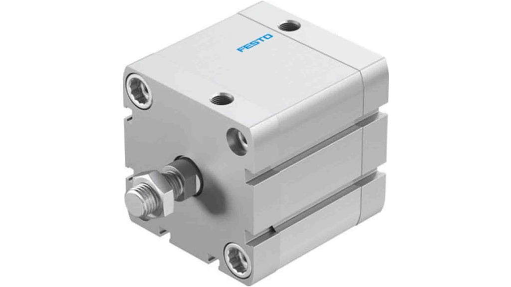 Cilindro pneumatico compatto a doppia azione Festo, conforme a ISO 21287, foro 63mm, corsa 30mm, filettatura M12x1,25, adatto per aria compressa filtrata e lubrificata o non lubrificata, anello di ammortizzazione flessibile, assemblabile in qualsiasi posizione, temperatura ambiente da -20 a 80 gradi Celsius, resistenza a corrosione moderata. Codice costruttore ADN-63-30-A-P-A.