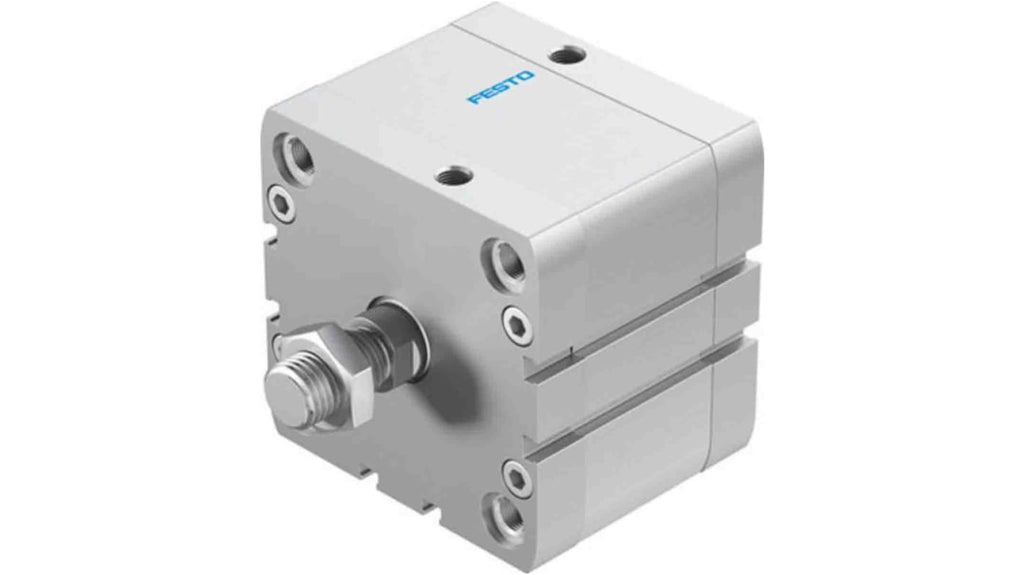 Cilindro pneumatico compatto a doppio effetto Festo, conforme a ISO 21287, foro 80mm, corsa 25mm, filettatura M16x1.5, ammortizzazione pneumatica autoregolante, temperatura ambiente da -20 a 80 gradi Celsius, resistenza alla corrosione moderata, assemblabile in qualsiasi posizione, progettato per aria compressa filtrata e lubrificata o non lubrificata. Codice costruttore ADN-80-25-A-PPS-A.