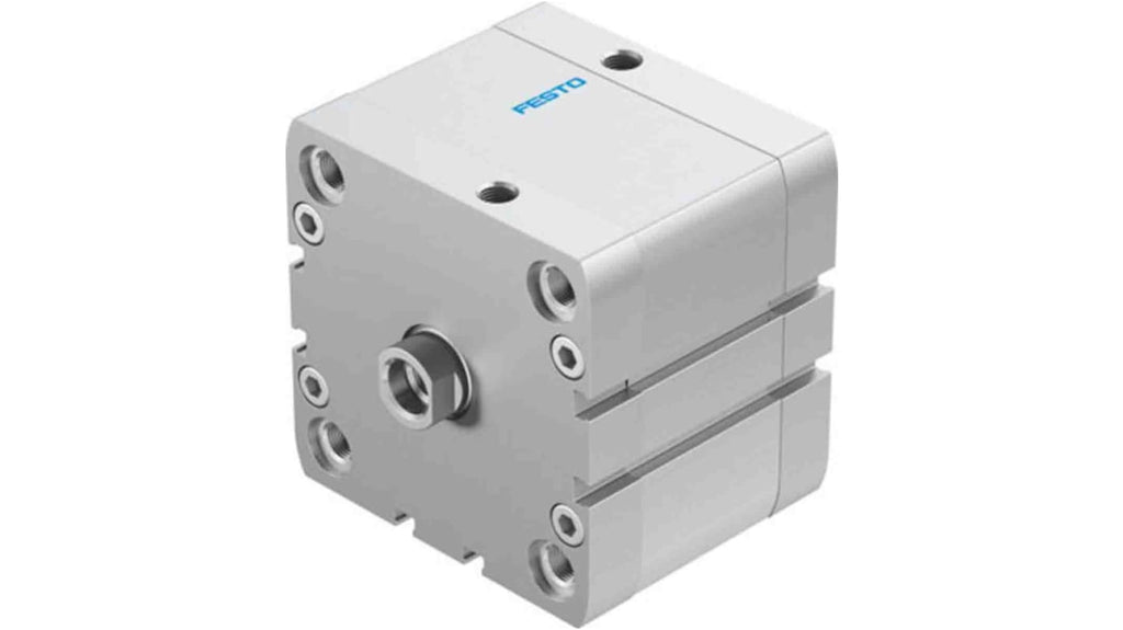 Cilindro pneumatico compatto a doppio effetto, Festo, conforme a ISO 21287, foro 80mm, corsa 25mm, filettatura M12, ammortizzazione pneumatica autoregolante, temperatura ambiente da -20 a 80 gradi Celsius, resistenza alla corrosione moderata, assemblabile in qualsiasi posizione, progettato per aria compressa filtrata e lubrificata o non lubrificata. Codice costruttore ADN-80-25-I-PPS-A.