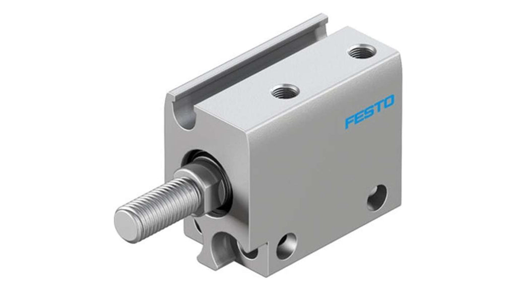 Cilindro pneumatico compatto a doppio effetto, foro da 10mm, corsa 5mm, collegamento pneumatico M3. Marchio Festo, modello ADN-S-10-5-A-A-F1A. Costruzione leggera in alluminio anodizzato, resistente alla corrosione, conforme alla direttiva RoHS. Pressione di esercizio variabile da 0,1 a 0,8 MPa. Ottimizzato per applicazioni nella produzione di batterie agli ioni di litio. Rilevamento interruttore di prossimità per maggiore efficienza operativa.